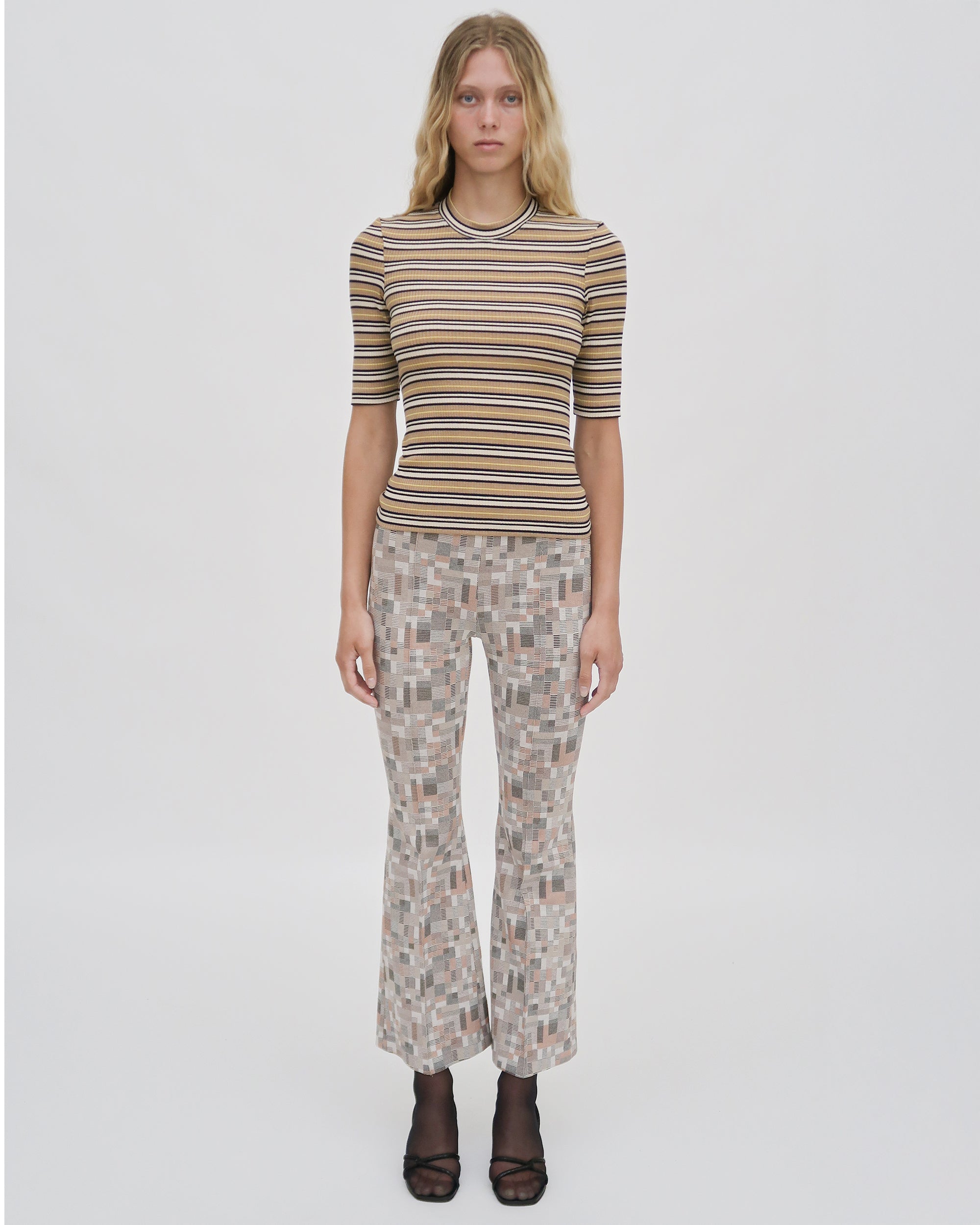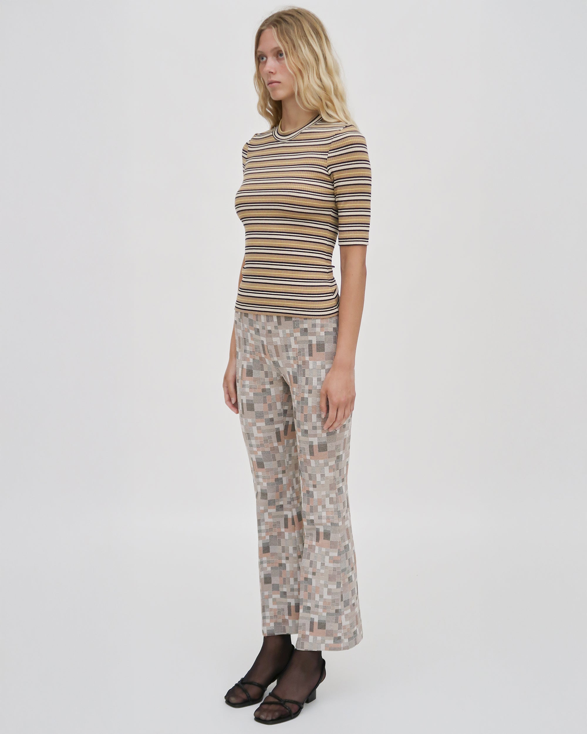 A graphic update to a foundational silhouette. This striped T-shirt is cut from ribbed stretch cotton jersey with a close, body-skimming fit. The cropped sleeves hit just above the elbow for a clean, modern proportion, while the multicolor stripe pattern adds subtle visual rhythm. Designed to stand alone or layer effortlessly under tailoring.