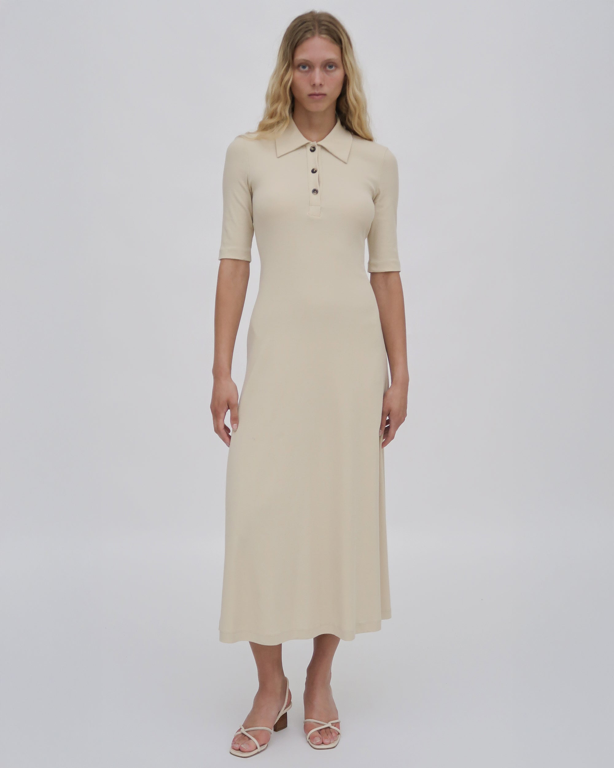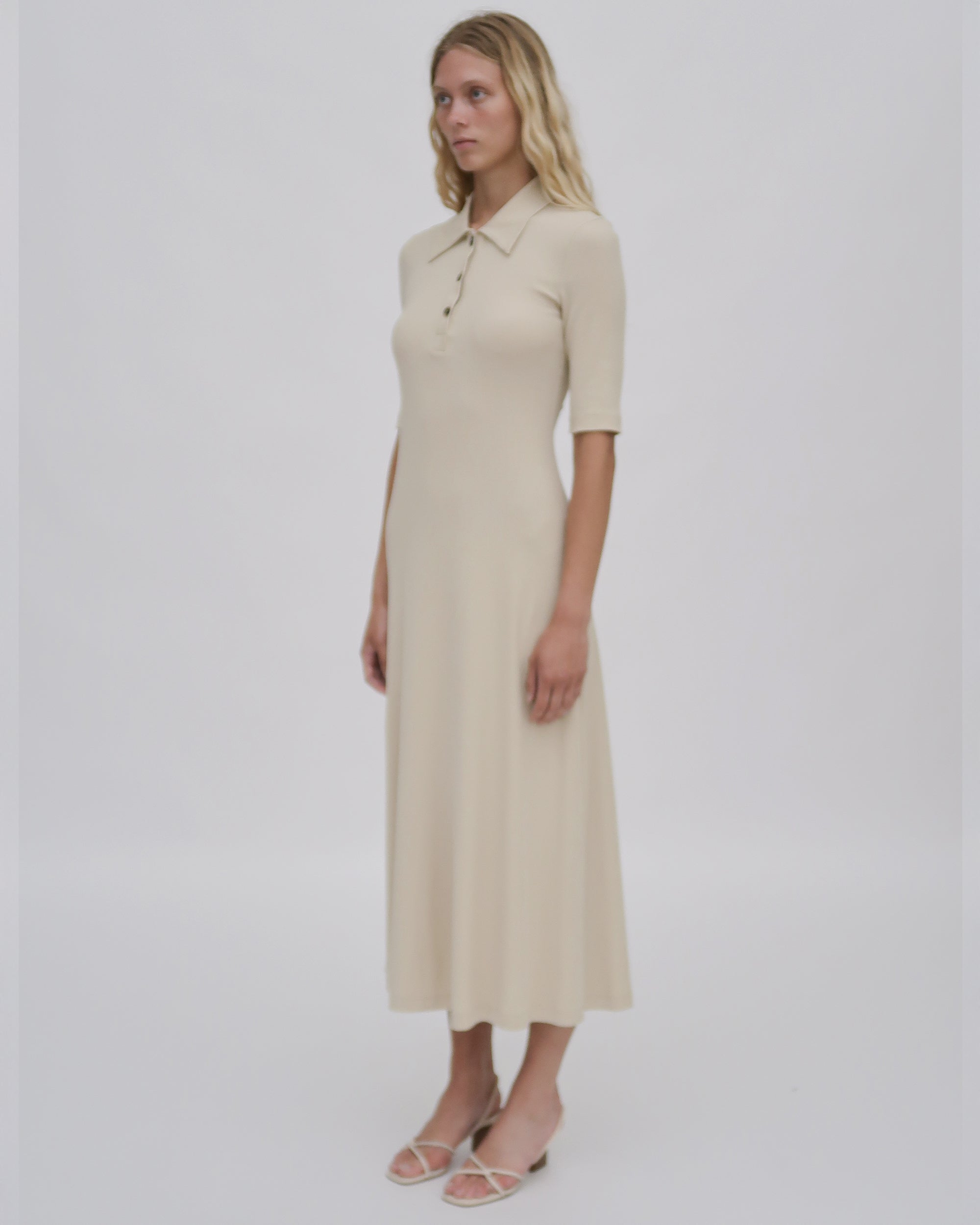 Cut close to the body before falling into a fluid A-line shape, this comfortable dress silhouette is effortless yet refined. The soft feel of the signature fiber Mercerized Cotton Jersey makes the piece infinitely wearable and easy to style while still flattering the natural body.