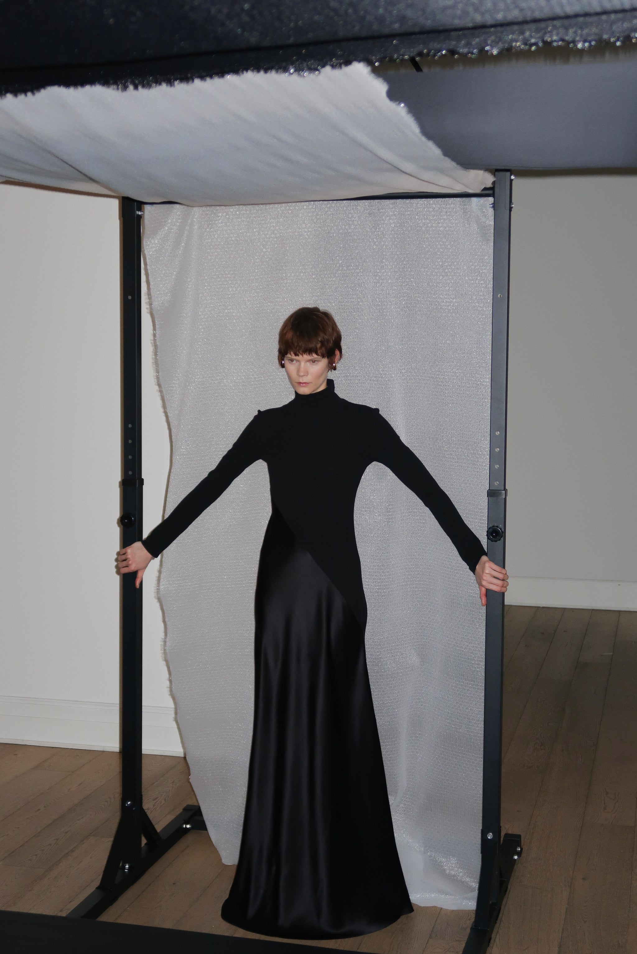Minimalism with quiet complexity. This turtleneck maxi dress is constructed from a combination of Silk Satin paired with Mercerized Cotton Rib Jersey fabrics, each cut on the bias to create fluid movement and subtle architectural lines. The elongated silhouette skims the body without clinging, while the high neckline and tonal paneling lend a modern, sculptural finish. Understated yet distinctive Rosetta Getty iconic design.