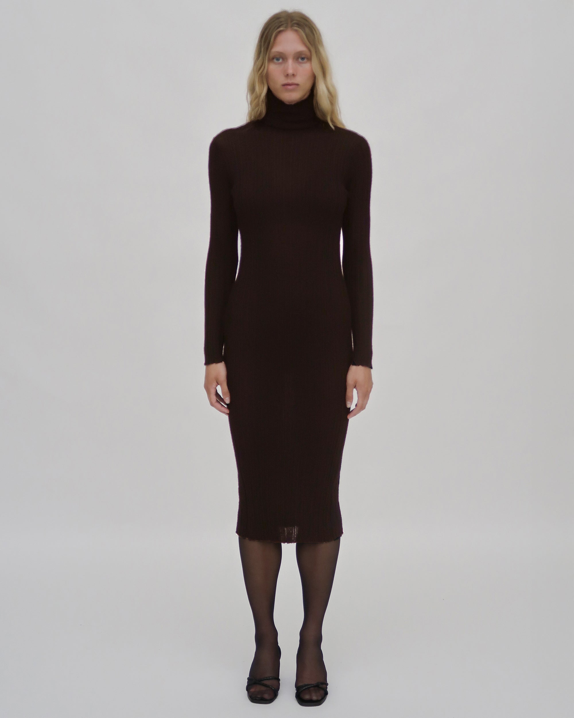 A study in texture and form. This turtleneck dress is crafted from featherweight alpaca gauze with allover plissé pleating, creating soft volume and a fluid silhouette that skims the body. The tonal interplay lends quiet dimension, while the semi-sheer construction makes it ideal for layering or elevated standalone styling.