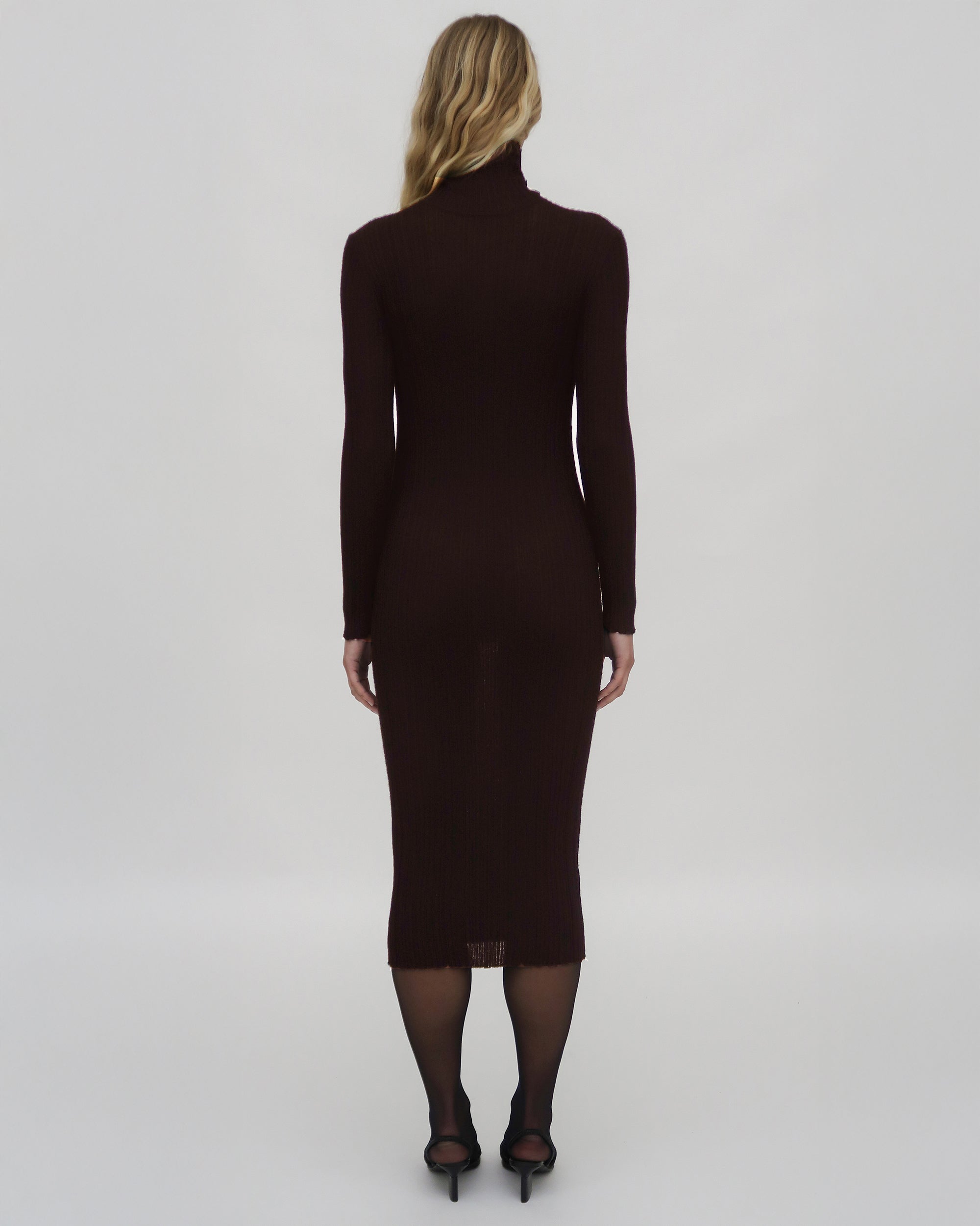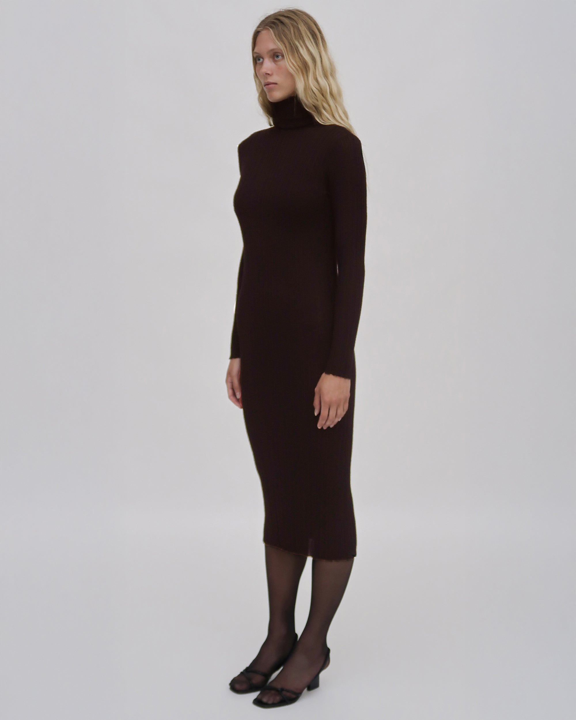 A study in texture and form. This turtleneck dress is crafted from featherweight alpaca gauze with allover plissé pleating, creating soft volume and a fluid silhouette that skims the body. The tonal interplay lends quiet dimension, while the semi-sheer construction makes it ideal for layering or elevated standalone styling.